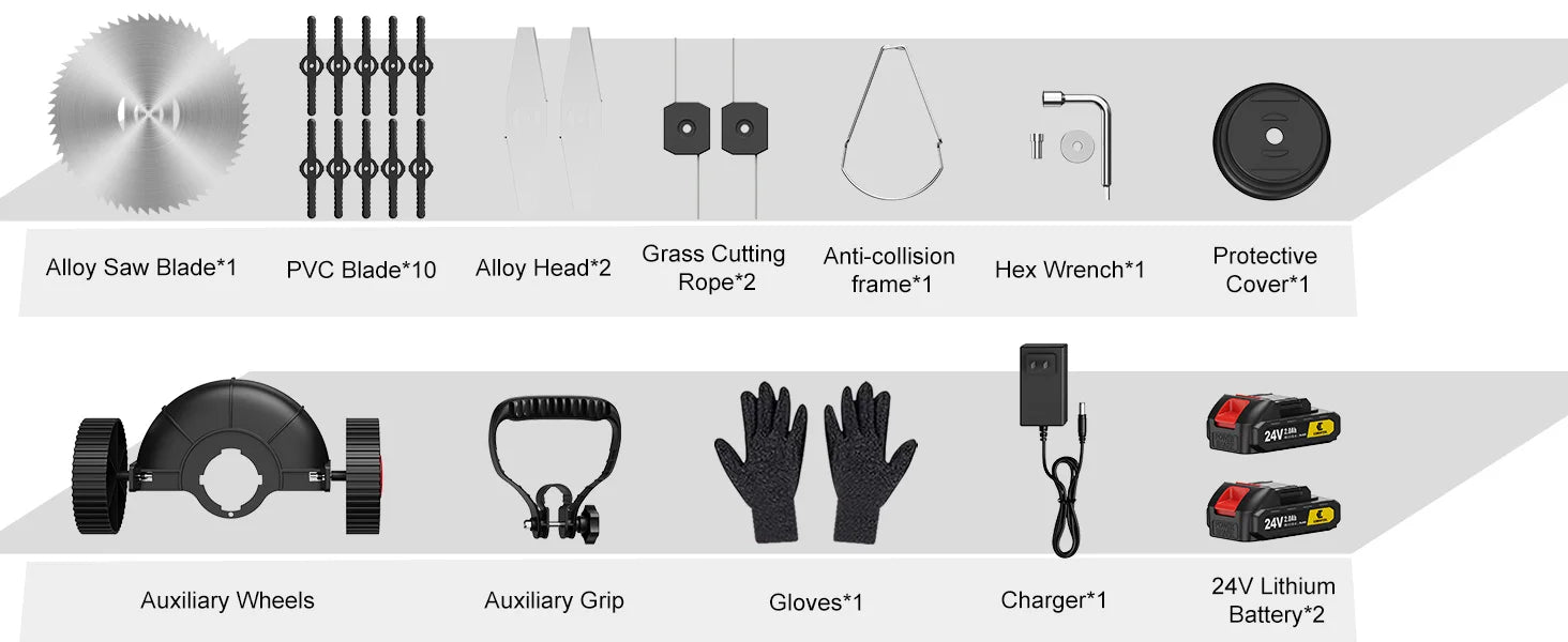 Maximum cost-effectiveness: The package includes 1 mower, 2 batteries, 1 charger, 1 alloy saw blade, 2 alloy cutters, 10 PVC blades, 1 hex key, 2 grass cutters, 1 pair of gloves, 1 auxiliary wheel and 1 user manual. With this all-inclusive package, you get maximum value for money for a variety of trimming needs.